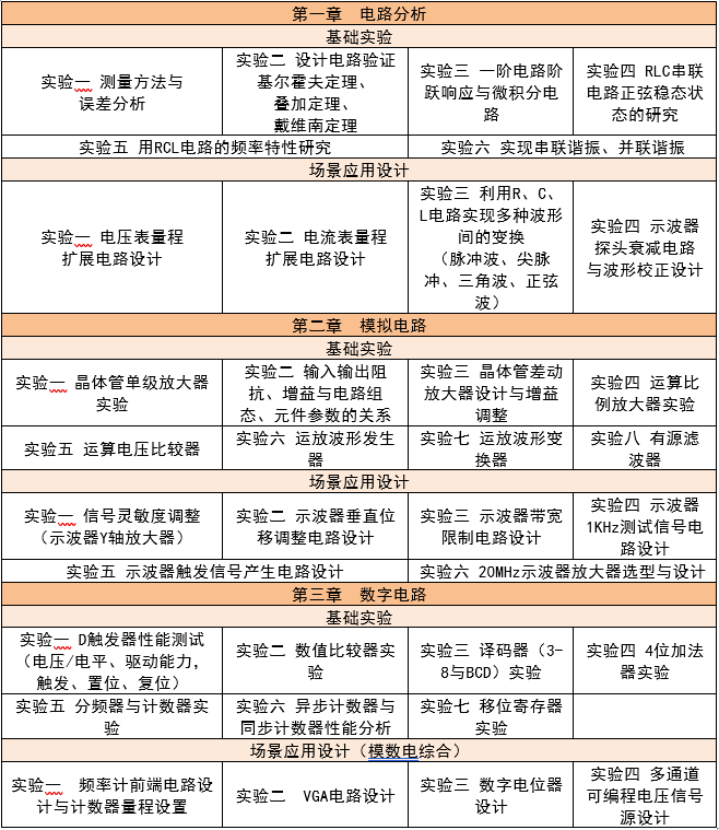 测试仪器前端含6大模块:电路分析实验、模拟电路自主设计、数字电路自主设计、单片机开发、直流电压电流表开发,及8个示波器模拟前端(含耦合、衰减等8项功能)。各模块支持对应课程原理实验及场景应用设计;单片机模块可实现示波器控制及多仪器测量显示;直流电压电流表模块与电路分析模块配合实现量程扩展;示波器模拟前端模块培养学生器件选型、电路调测及问题解决能力。