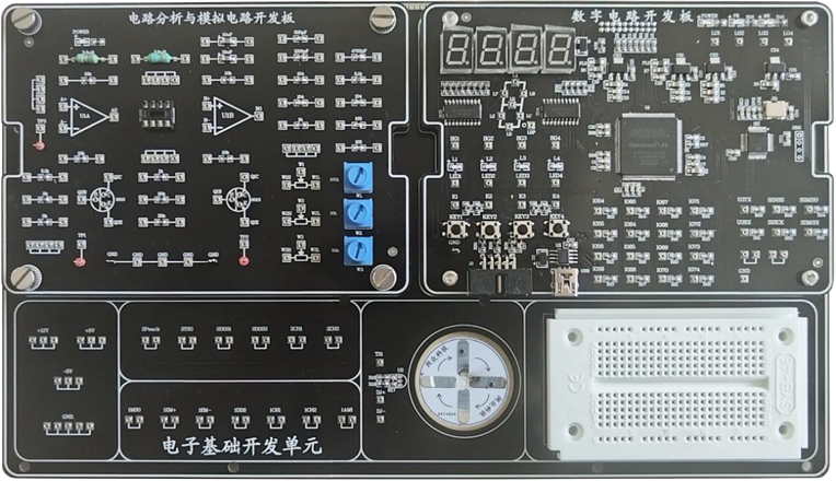 1、实验平台采用便携仪表式,内置工控PC机(13寸1920*550分辨率的长条液晶屏),标配电路分析、模拟电路、数字电路与数字系统设计三种实验板卡,每种板卡支持一门课程所有实验;