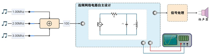 ① 电台信号接收:平台输出三个不同频点的广播音乐信号(三个信号频率可设),学生利用开发模块自主设计选频电路,接收其中一个广播信号,要求音质纯净。