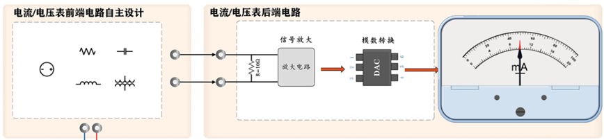 ②电压电流表:平台内嵌1mA表头,学生利用开发模块自主设计分压分流电路,设计10mA、100 mA电流表,1V、10V电压表;