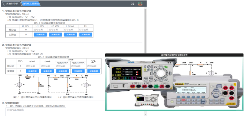⑴线上实验,即学生在大屏液晶的浏览器上完成所有实验操作,包括:实验内容选择、实验课件与实验框图调阅、实验电路搭建、激励与电路参数设置、测试节点选取、信号(电量)测量、实验电路与数据存取、电子报告设计上传等;线上实验,真实电路、真实数据,虚拟或实物仪器测量,原理与验证实验效率;