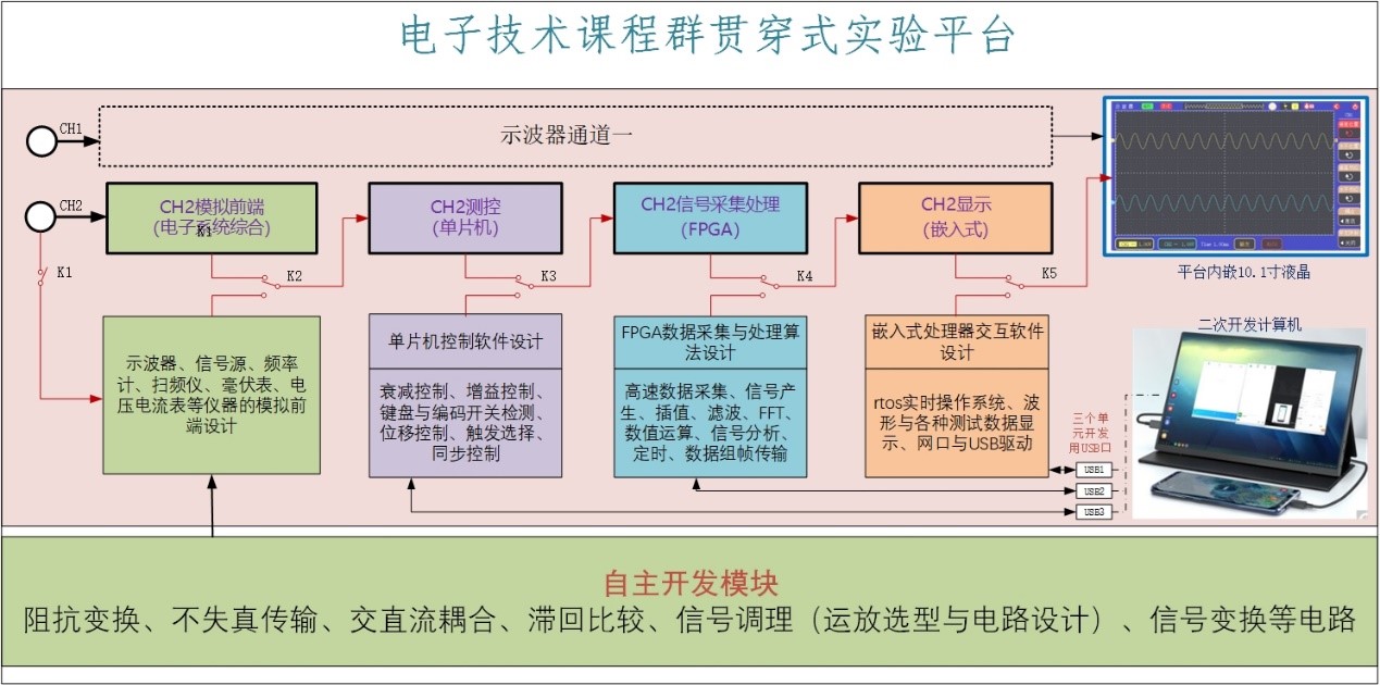 本平台以便携式仪器 + 自主开发模块为核心,面向电子信息专业学生,支撑电子系统综合、单片机测控、FPGA 信号采集与处理、嵌入式人机交互等课程的综合实验及课程群知识点贯通式工程设计。