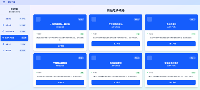 RZ-sbrpA/9653型高频电子线路实验单元,是为适应当前通信工程专业课程教学及实验教学的的要求,精心研制的新一代高频电子线路实验平台。该平台既能进行传统实验,还能结合当前教学技术发展的几大趋势,即:实验教学的工程化,实验设备的网络化,课堂教学的智能化,可以满足通信电子相关专业教师和学生进行在线实验课件、实验流程图、实验视频、实验报告模板调阅,内嵌测试仪器在线测试、在线生成并上传电子报告等实验操作。