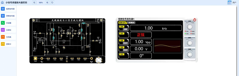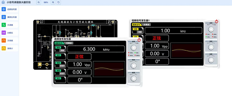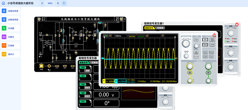 通信技术子平台,支持高频电子线路、嵌入式技术等课程实验,内嵌:函数信号源、三用表、2通道示波器、扫频仪、频率计、毫伏表等测试仪;