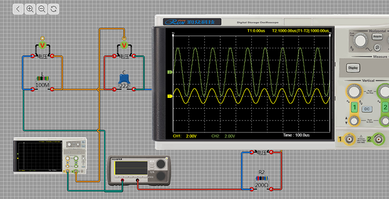 用户通过浏览器自由完成实验内容,调整电路参数,通过线上平台虚拟仪器实时测试测试点信号,截图、保存、完成电子报告。