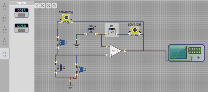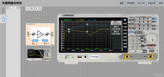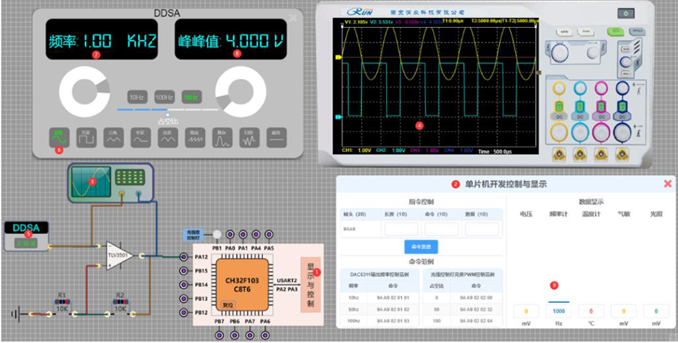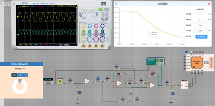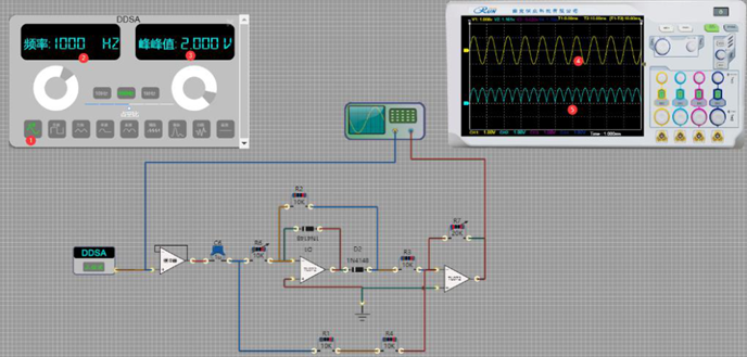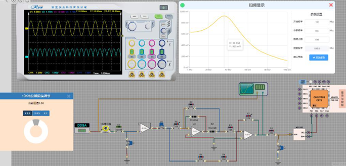 3、平台配备基于真实面板设计的虚拟仪器,含双通道示波器、DDS 高低频信号源、频率计、扫频仪等,兼顾实时测量与实际仪器操作训练。