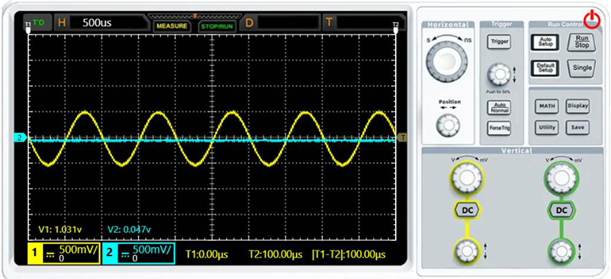 虚拟示波器参数:双通道100MSPS采样;通道输入阻抗1MΩ;触发支持上升沿、下降沿触发,触发电平可调;支持测量通道交/直流耦合;