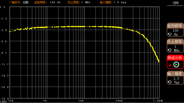 ⑤ 示波器试接口-运放增益带宽积测试:运放增益带宽积观测是针对运管放大器的增益带宽积参数的实验和观测仪器,提供了学习理解运放器件的GBW等重要参数的直观化实验效果,支持扫频信号的频率范围和频率步进、扫频幅度等参数调节,自动生成运放的增益带宽积曲线;