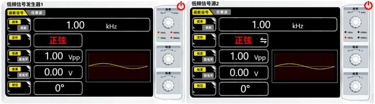 ⑨ 低频信号源1和2:集成常用正弦、脉冲、三角波、锯齿波、半波、全波、复杂信号、 单边指数。钟形函数、抽样函数、调幅波、调频波、双边带、扫频、音乐、直流等常用信号,信号频率、幅度、偏置等参数可调;支持的输出信号频率不低于100KHz,交流信号输出幅度不低于5VPP,直流信号输出-3V至+3V;