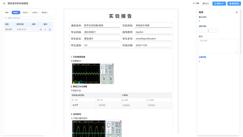 ⑵电子报告生成与上传,调实验报告模板、编写实验目的等相关内容、填入实验数据与测试波形等、上传实验报告至服务器。