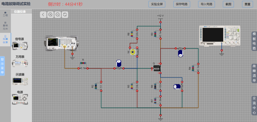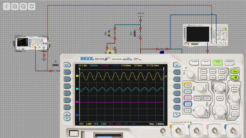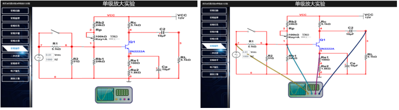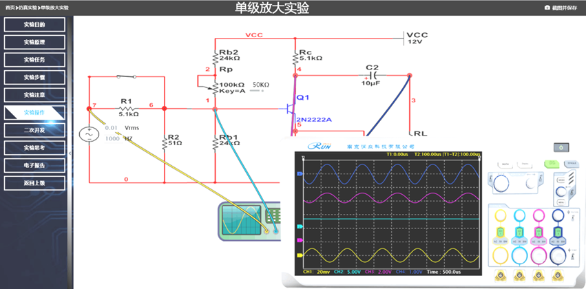 1、原理仿真:基于BS架构,学生能在浏览器上完成所用实验电路的仿真:工作点调整、电路参数配置、信号源选择、反馈量控制、响应信号测试等;配套提供和商用仪器面板一致的4通道虚拟示波器、虚拟任意波形发生器等仪表;