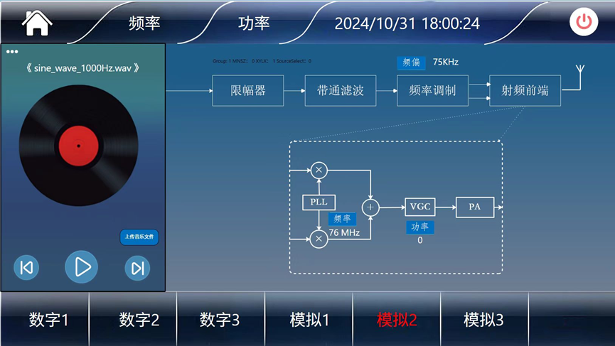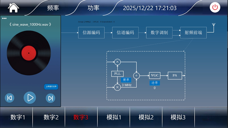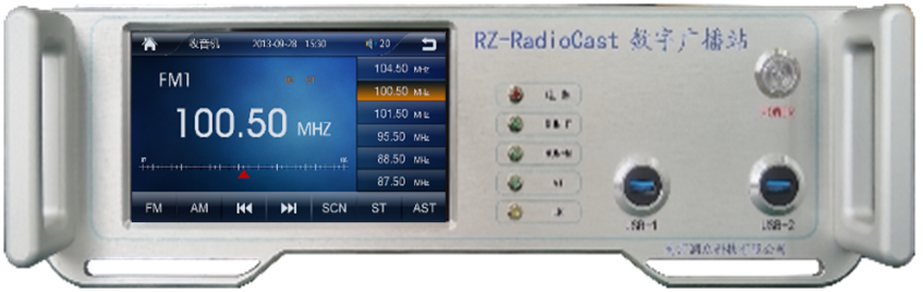 1、广播站内置 5 寸触摸屏,屏底设 6 个广播台配置键(设置信号制式),屏顶设频率、功率配置键,左侧配音乐播放器,可选择各台信源。