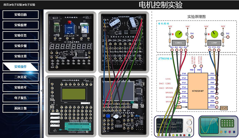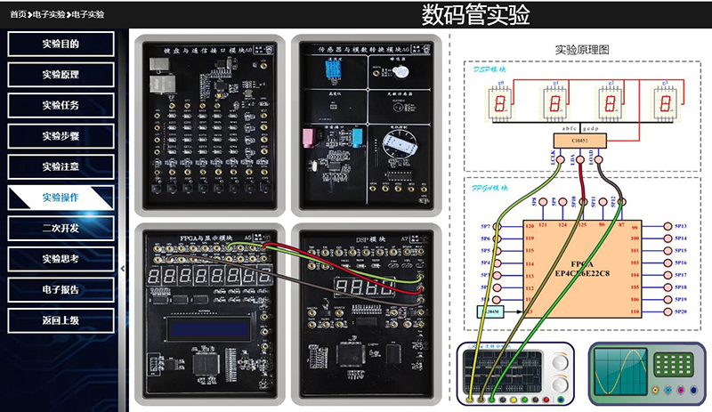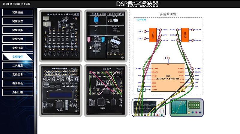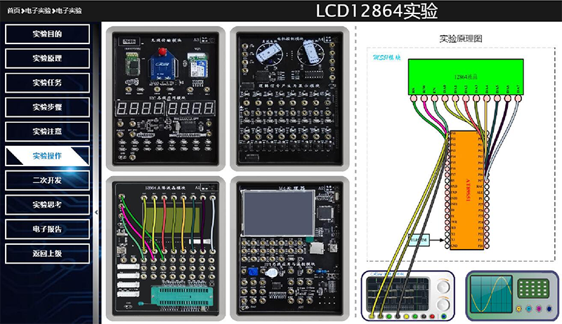 实验平台在网管和操作平台的支持下,学生能在客户端浏览器上搭建实验电路(电子连线设计微处理器各种接口电路),设计并远程加载开发软件,虚拟仪器观测IO口信号,截取测试数据和波形,设计并上传电子报告;