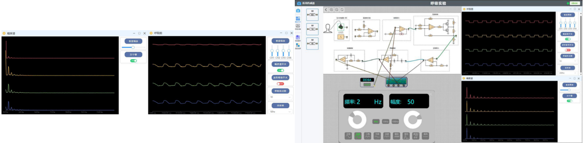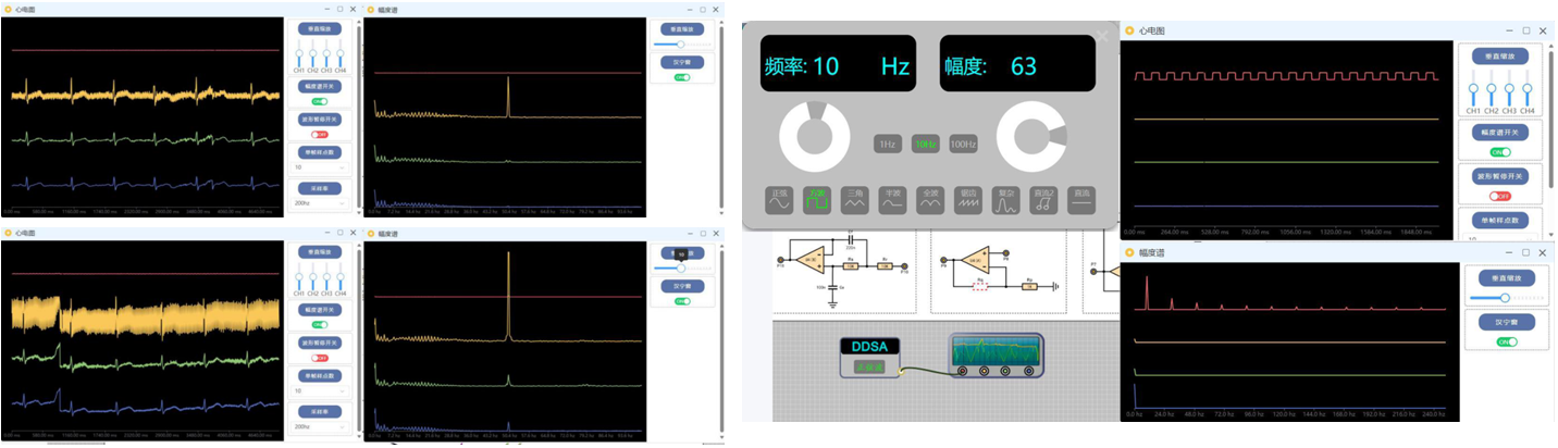 接/不接右腿驱动电路的人体激励各电路环节的心电图和幅度谱(心电实验,右键数据导出到excel)、内置信号源配置界面及波形显示界面