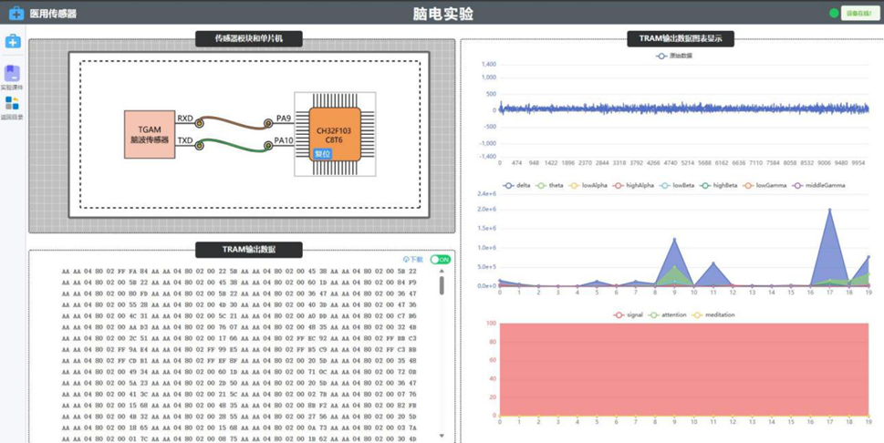 5、核心功能:浏览课件、检测设备与网络状态;在线查看电路拓扑、搭建调理电路;虚拟仪器测试(波形、幅度谱等);数据记录、导出与分析;数字型模块支持单片机程序二次开发在线加载;线上实验实时同步实物数据。