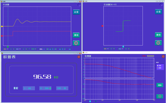 (3)平台内置双通道数字示波器,支持双通道时域波形的实时显示,支持Y-T和两种X-Y显示模式,示波器内置含数显的双游标测量,可跟踪游标的测量值,计算游标的时间差,幅度差等。