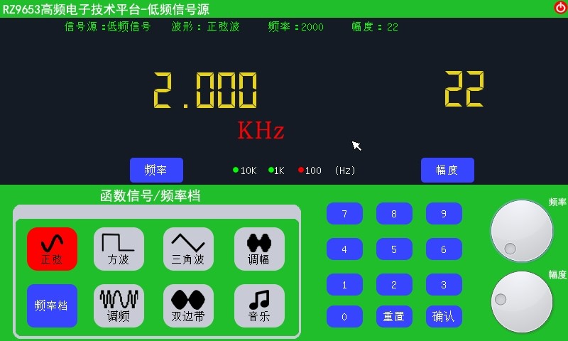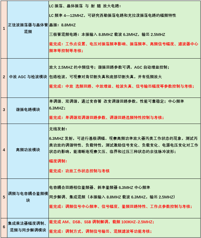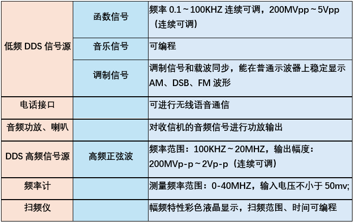 1.系统内置DDS低频信号源(函数信号、音乐信号、调制信号和载波信号同步的AM、DSB、FM波形)、麦克信号、DDS高频信号源、频率计;