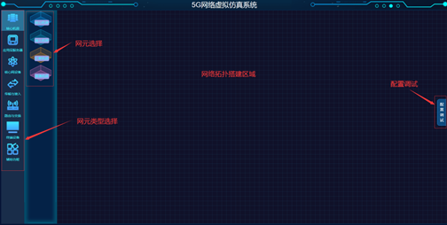 5G移动网络仿真系统为B/S架构系统,可以通过浏览器网页登录系统。进入系统后可以看到整个仿真页面,包含网元类型选择区域,网元选择区域,网络拓扑搭建区域,配置调试区域四个主要功能区域。