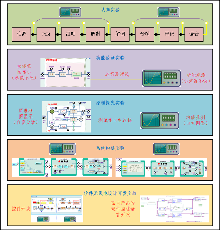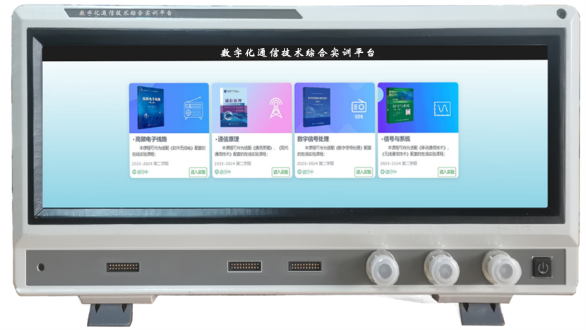 数字化通信技术综合实训平台内嵌实验所需测试仪器、实验模块、射频前端、工控PC机;学生可以线上线下、随时随地不受时空限制进行系统认知、功能验证、原理探究、系统构建、算法设计4个层次实验。