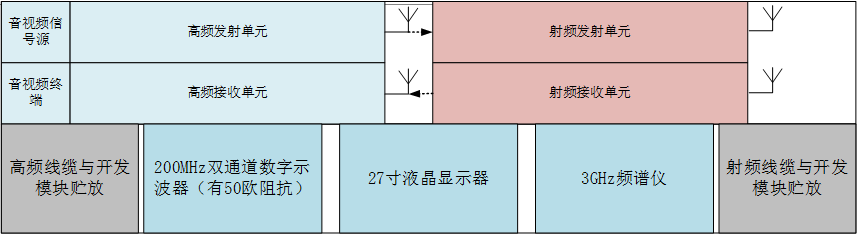 平台设计结构:实验平台拟分两层,底层主要存放测试仪器,上层配置高频和射频电路实验单元,2组收发天线置于平台顶部。