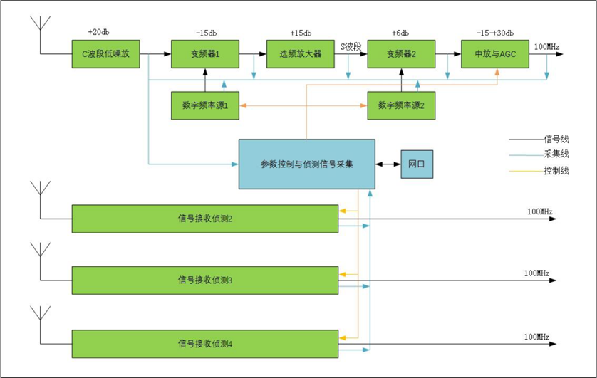 信号接收子单元:4个通道,接收C波段信号,采用模块化级联架构,含天线、低噪放、变频器等组件;