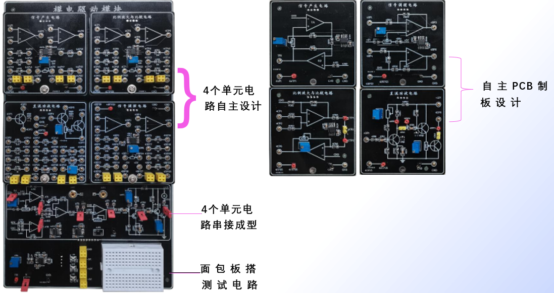 ★设计与达标测试实验:以小车驱动与测控项目牵引,给定性能指标,学生围绕项目需求,用纯模拟电路或纯数字电路,设计并选择单元电路形式,串接电路,验证设计、并测试调整电路性能。