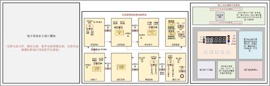 2、 以数字示波器为工程案例,将示波器模拟前端、人机交互、数据采集与处理、波形 显示等单元设计成可插拔式模块,学生能自主设计模块和开发各种测控软件;