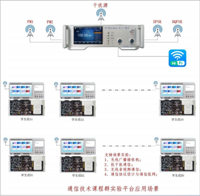 配套能设置通信制式的数字广播站,学生 可自主设计无线模拟或数字接收机,完成通信工程专业设计实训。