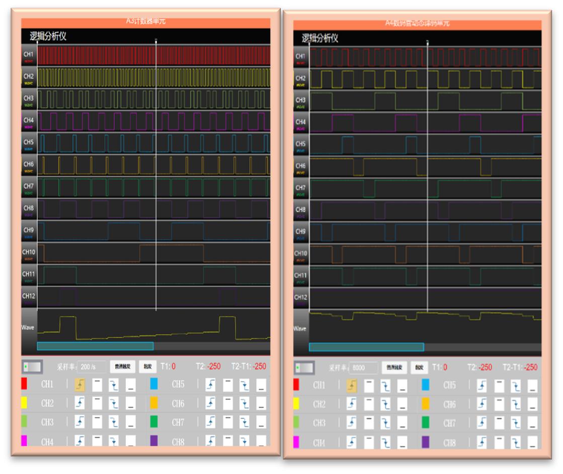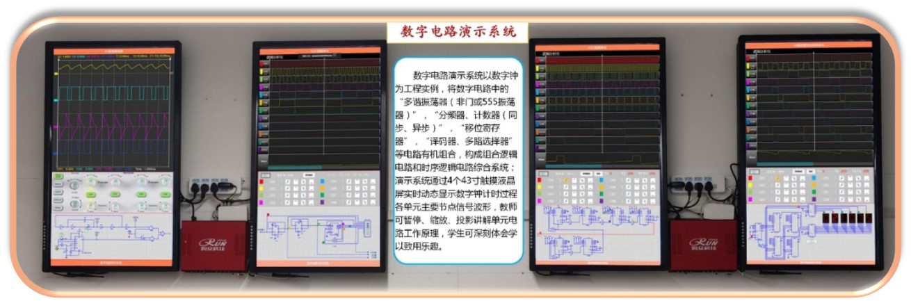 数字电路演示系统以数字钟为工程实例,将数字电路中的“多谐振荡器(非门或555振荡器)”,“分频器、计数器(同步、异步)”,“移位寄存器”,“译码器、多路选择器”等电路有机组合,构成组合逻辑电路和时序逻辑电路综合系统;演示系统通过465寸触摸液晶屏实时动态显示数字钟计时过程各单元主要节点信号波形,教师可通过PC机、平板、手机APP等控制系统暂停、缩放、投影讲解单元电路工作原理,学生可深刻体会学以致用乐趣。