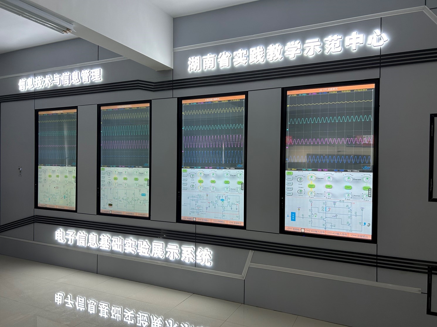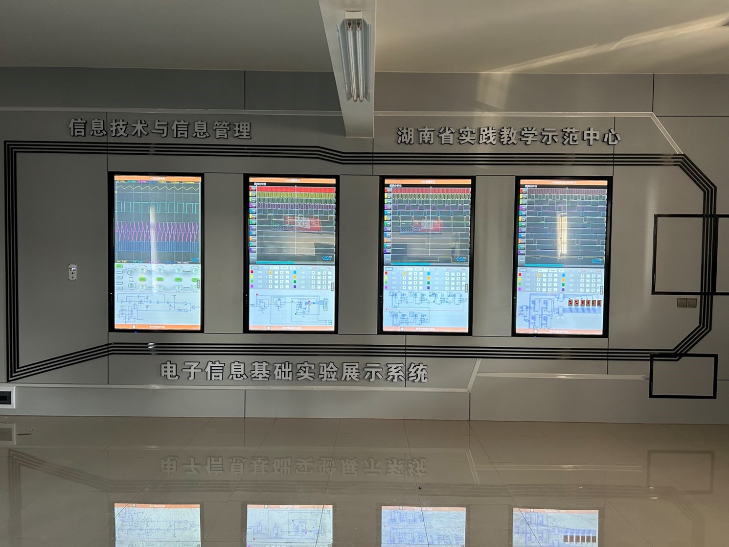 电子信息基础演示系统以数电的“数字钟”和模电的“音响“为工程实例,4个65寸触摸屏实时动态显示过程各单元主要节点信号波形;既可以作为实验室文化建设,也可以作为教学设备使用。老师能够投影讲解单元电路工作原理,学生能在展示框图上切换工作模式、配置工作参数、观测电路响应结果,提升学习兴趣。